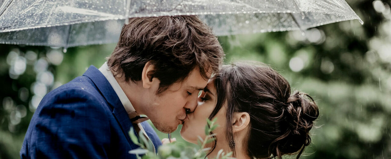 Met regen verandert de setting van je bruiloft: glinsterende druppels op bloemen, reflecties in plassen en intieme momenten onder een paraplu zorgen voor unieke en romantische foto’s. Bespreek vooraf met je fotograaf hoe jullie van het weer juist een sfeervol decor kunnen maken. Het zachte licht van een bewolkte lucht geeft bovendien vaak een prachtig resultaat, veel zachter en flatterender dan fel zonlicht. Regen kan zo zorgen voor beelden die juist extra uniek en onvergetelijk zijn.