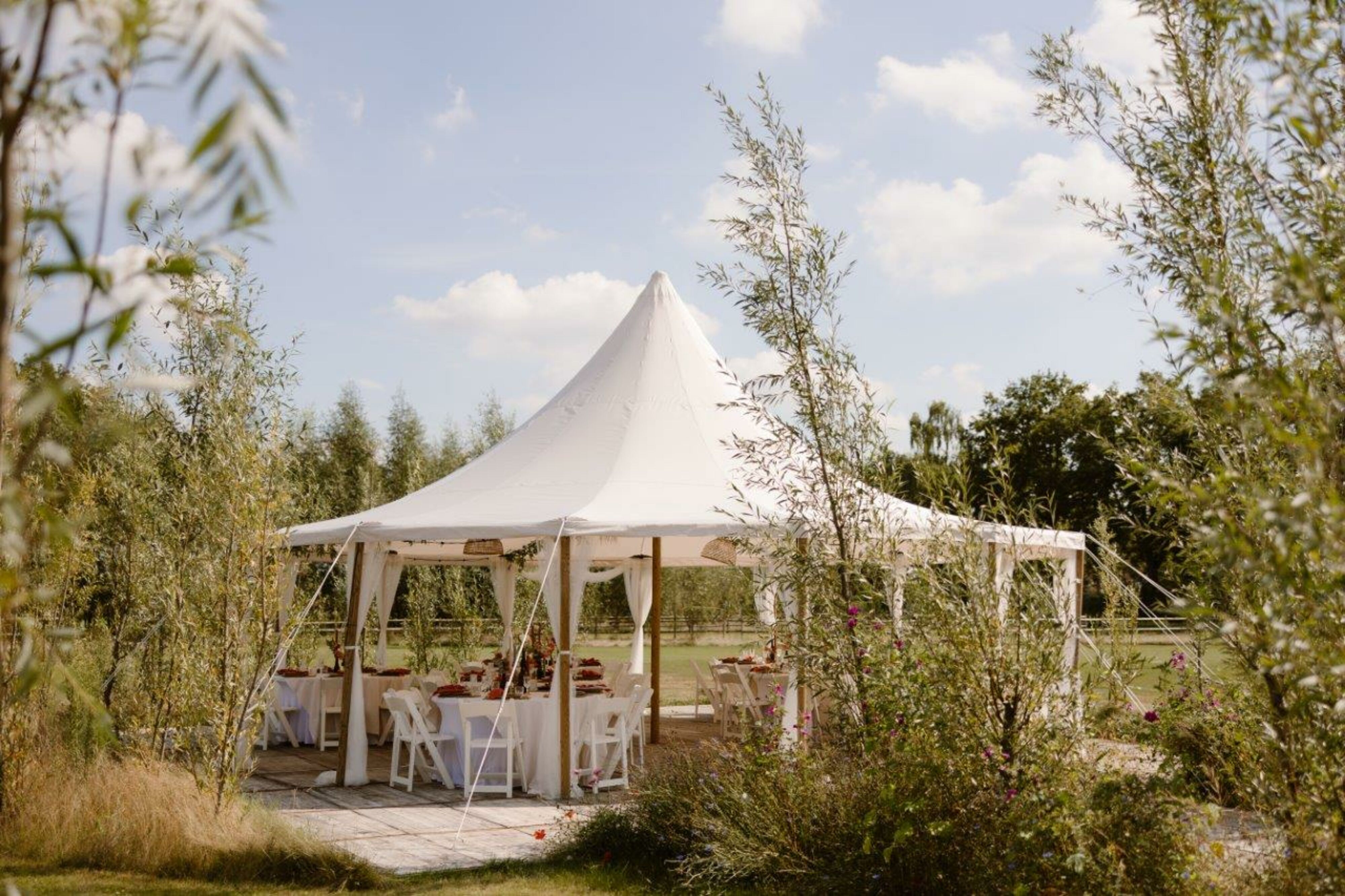 Bij Blooming in de Kas vieren jullie jullie complete trouwdag op één locatie. De ceremonie en het diner kunnen plaatsvinden in de kas, buiten tussen de fruitbomen, voor de kas of midden in het groen. In de zomer staat er een stijlvolle tent buiten en in de winter zorgt onze warme oranjerie voor een intieme setting. Zo is deze trouwlocatie het hele jaar door perfect voor jullie bruiloft.